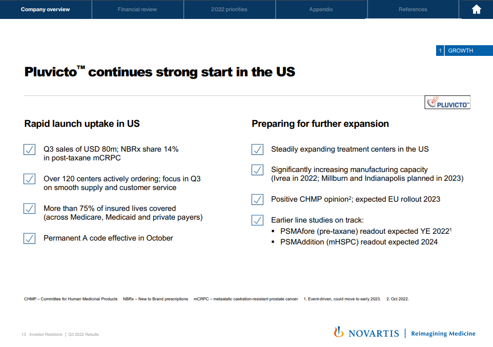 此外,已在美国和欧洲获批上市、用于治疗前列腺癌的靶向放射性同位素疗法Pluvicto(lutetium Lu 177 vipivotide tetraxetan),第三季度销售额达到8000万美元。