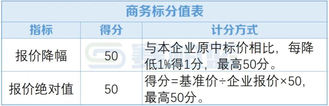 商务标满分100分,其中报价降幅50分,报价绝对值50分,具体计分方式如下:
