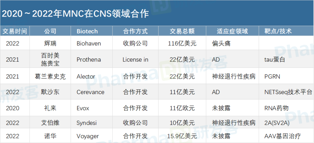 今年5月公开的辉瑞116亿美元收购Biohaven公司,到目前为止依然是今年金额最高的并购。对于辉瑞而言,这是重新布局中枢神经系统(CNS)的举措;从行业角度来看,跨国药企回归是该领域药物开发回暖的一个重要标志。而各类交易是回归的主要途径。