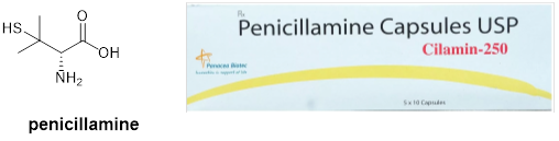 青霉胺(Penicillamine,图3)用于治疗罕见的遗传性疾病威尔森氏症,这种症状可导致体内铜的积累而产生致命性的结果。后来这种药品被发现可有效治疗关节炎。