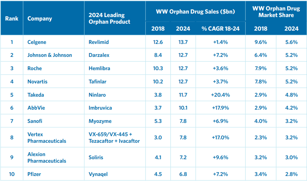 表1. 全球孤儿药10强及其领导产品(2018-2024)