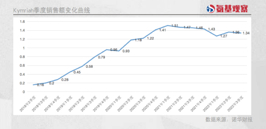 如下图所示,在2021年第一季度,Kymriah达到了1.51亿美元的季度销售额峰值,随后一路向下,在2022年第一季度一度跌至1.27亿美元。