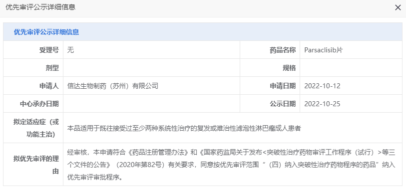 10 月 25 日,CDE 官网显示,信达生物的 PI3Kδ 抑制剂 Parsaclisib 已经递交上市申请,并拟纳入优先审评,用于既往接受过至少两种系统性治疗的复发或难治性滤泡性淋巴瘤成人患者。
