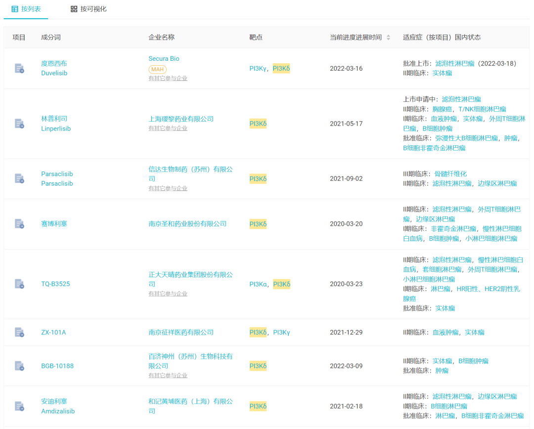 国内来看,Parsaclisib 是第 3 款申报上市的 PI3Kδ 抑制剂。今年 3 月,石药引进的 PI3Kγ/δ 抑制剂度恩西布已经获批用于滤泡性淋巴瘤;恒瑞和璎黎合作的林普利司自去年 5 月申报上市,也有望在年内获得批准。