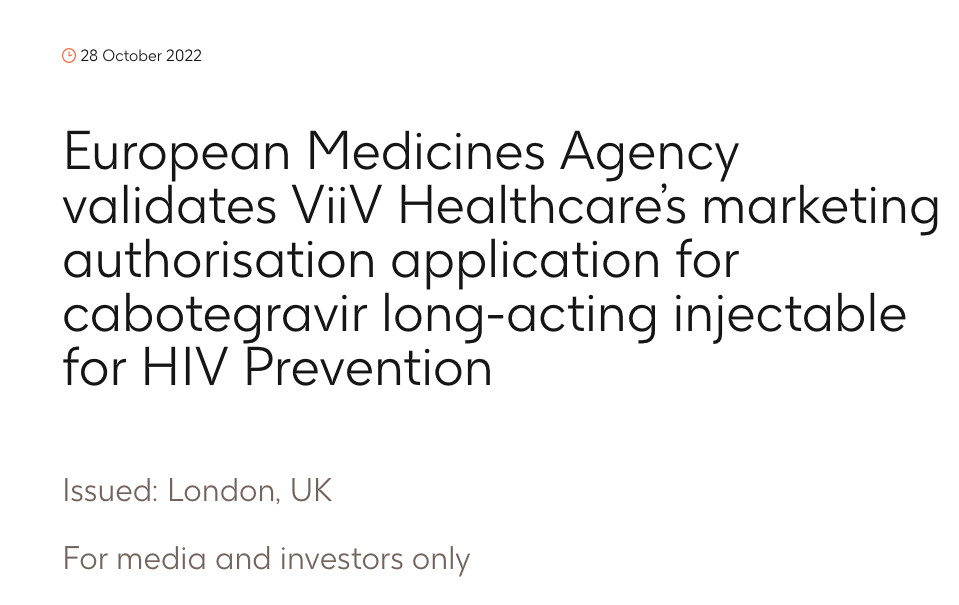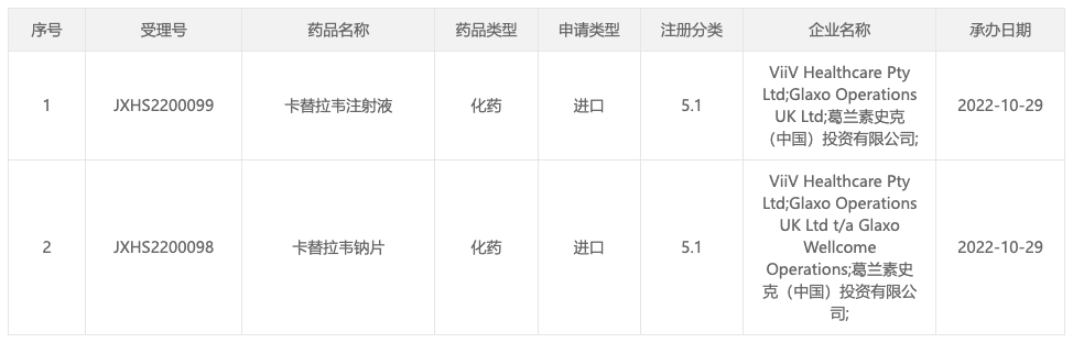 10 月 29 日,据 CDE 官网显示,GSK/ViiV Healthcare HIV 药物卡替拉韦注射液与卡替拉韦钠片在国内申报上市(受理号:JXHS2200098/JXHS2200099)。
