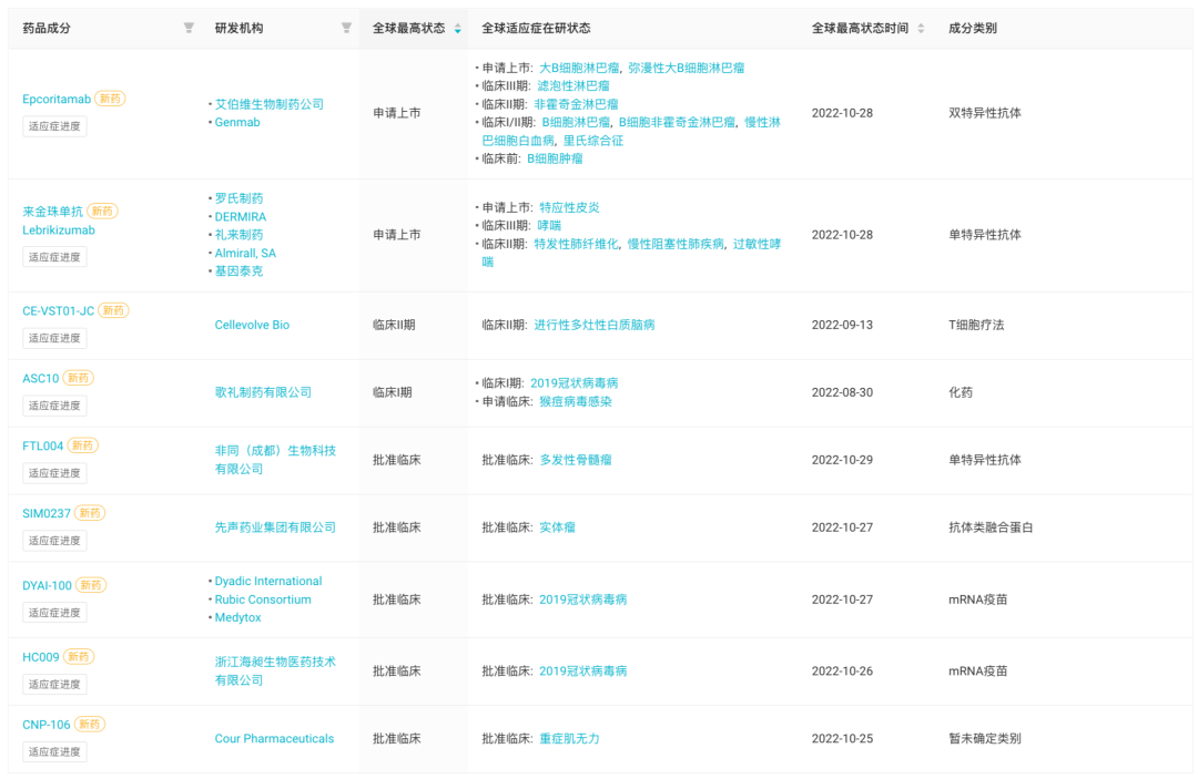 据Insight 数据库 统计,上周(10 月 24 日 - 10 月 30 日)全球共有 45 款创新药(含改良新)研发进度推进到了新阶段,其中 8 款首次申报临床,14 款首次获批临床。