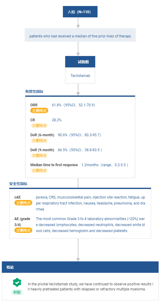 Teclistamab 的批准是基于 I/II 期临床试验 MajesTEC-1 研究(试验登记号:NCT04557098/NCT03145181)。这是一项单臂、开放标签、多队列、多中心剂量递增研究,以 ORR 为主要终点。