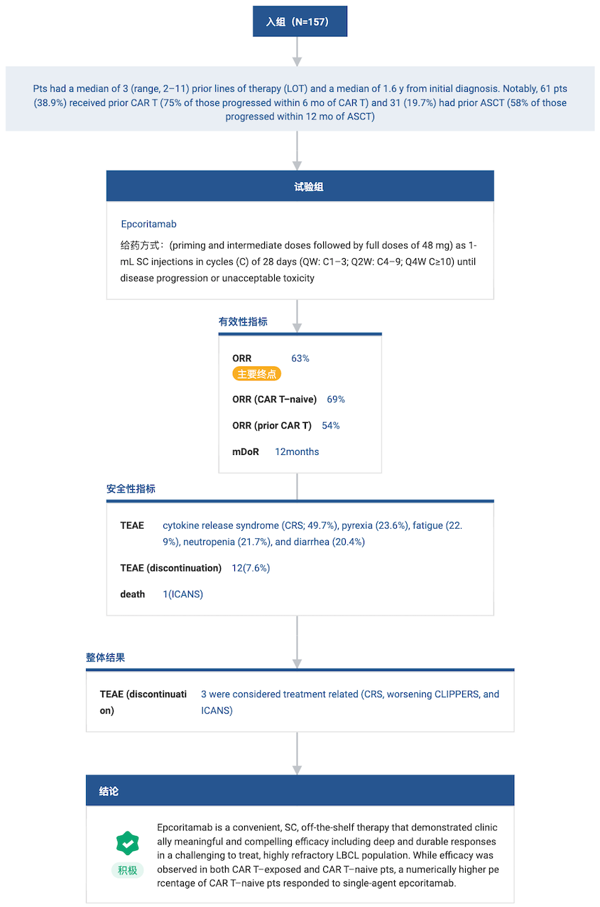 该研究队列包括 157 例复发/难治性 LBCL 患者,这些患者此前接受过中位 3.5 线(2-11 线)治疗,其中 38.9% 的患者此前接受过 CAR-T 细胞治疗。 该队列的关键结果显示,独立审查委员会(IRC)证实的客观缓解率(ORR)为 63.1%,观察到的中位缓解持续时间(DoR)为 12 个月。