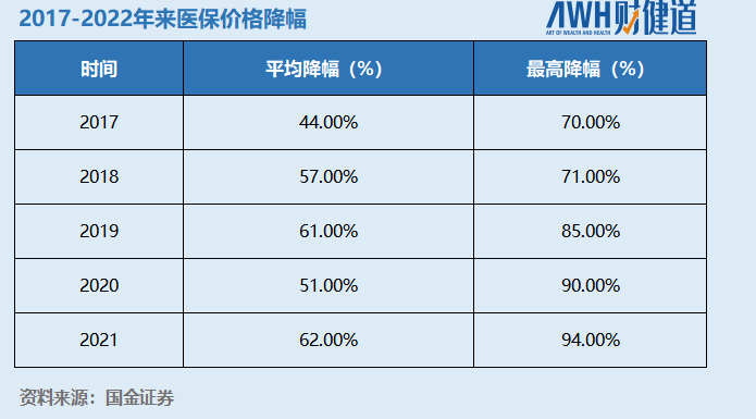 自2017年以来,多款独家创新药产品经过谈判进入国家医保目录。不过,医保谈判价格降幅都较大,降幅呈逐年走高趋势,并于2021达到降幅高潮,平均降幅达到62%,降幅高达94%。