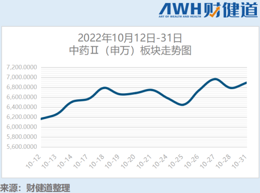 再来看中药。10月12日-31日,中药Ⅱ(申万)从最低点5974.80,上涨到了31日收盘点6889.29。