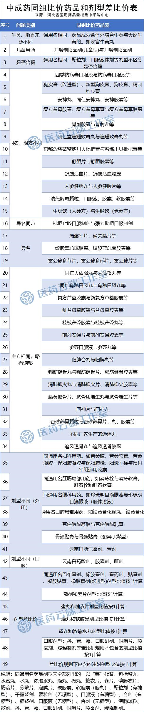 河北的做法是根据不同品种的用法用量,分为:儿童和成人、依体重精确使用的、用法用量随病程发生变化的、有多重适应症的、未明确适应症的、未明确用法用量的六种情况制定相应的申报方式。这一思路实属河北首创,值得大大点赞,不仅解决了中成药说明书、用法用量的较大差异、标准不统一的问题,在日治疗费用的基础上,继续解决行业难题并有了创新。值得学习和思考的,还不止日治疗费用的算法,在分组上,河北也详尽地列出各类药品可以分为一组、区分组别的情况。中成药不同组,将问题分为牛黄麝香来源不同、同名组方不同、剂型不同(外用)等几种情况。而在中成药同组比价表中,将问题分为:牛黄麝香来源不同、儿童用药、是否含糖、同名组方不同、异名同方、异名、主方相同略有调整、剂型不同(外用)等几种情况。