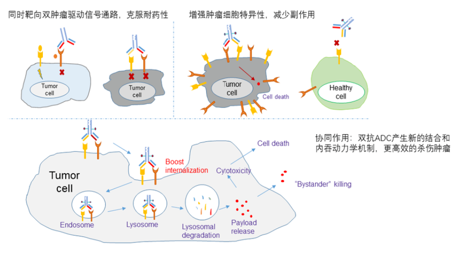 结合了双抗和ADC优势的双抗ADC药物,是一个更为崭新的概念。相较于单抗,一方面,通过双抗更加特异性地靶向肿瘤细胞,增加药物的安全性;另一方面,通过交联作用促进两个靶点的协同内吞,在提高毒素进入肿瘤细胞效率的同时,进一步通过减少受体蛋白在细胞膜上的表达量来抑制肿瘤细胞生长信号,达到更好的治疗效果。