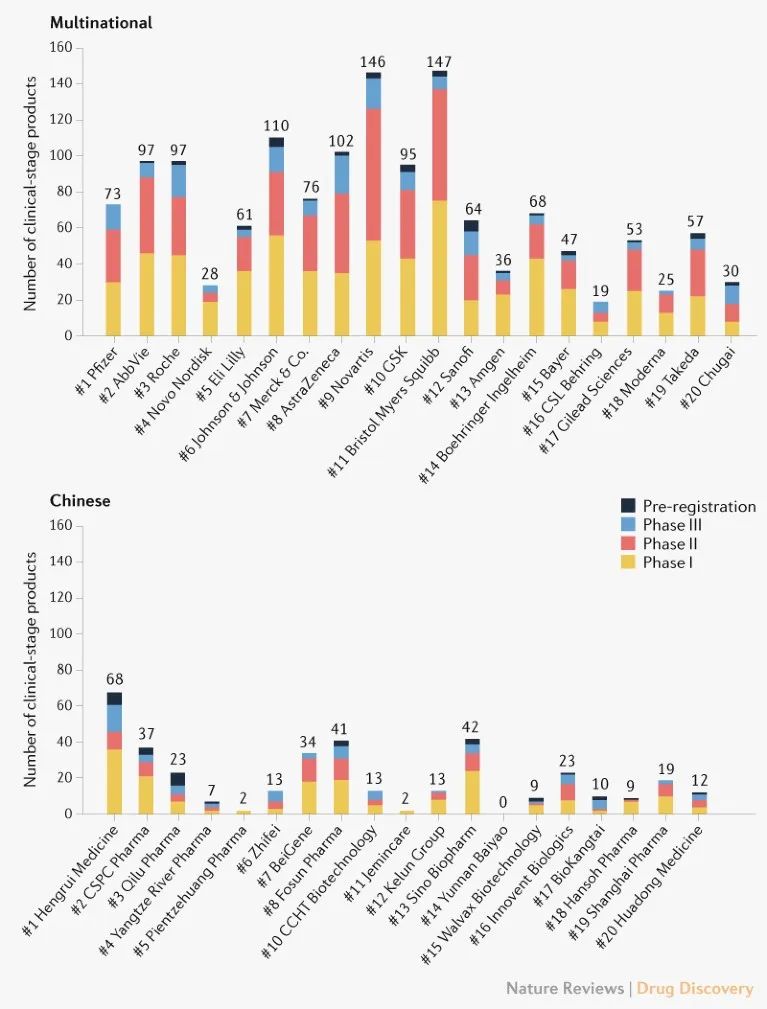 图1中国制药公司前20强和全球非中国公司前20强的临床阶段产品情况