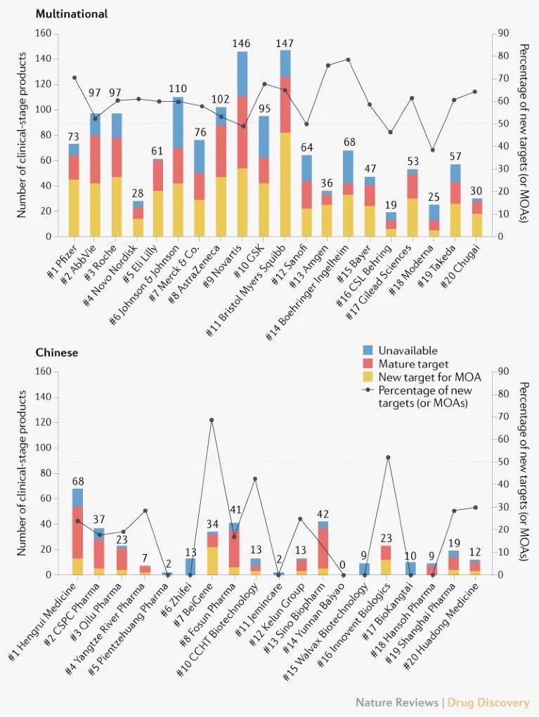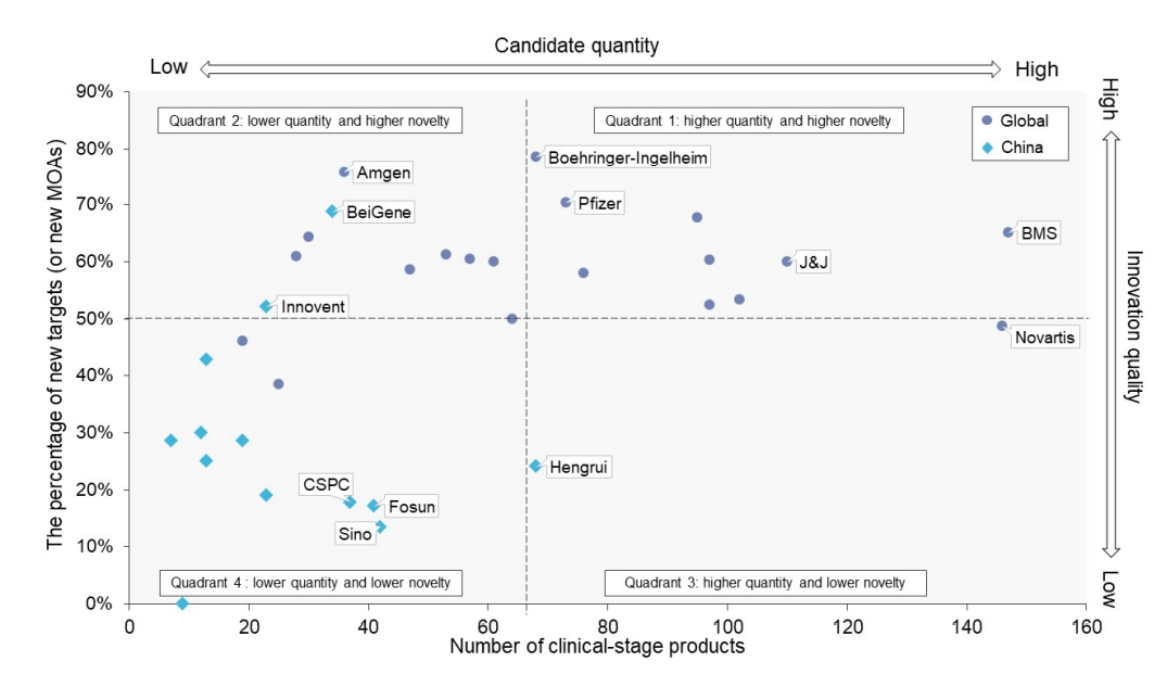 图3.评估中国和跨国制药公司临床阶段数量和新颖性
