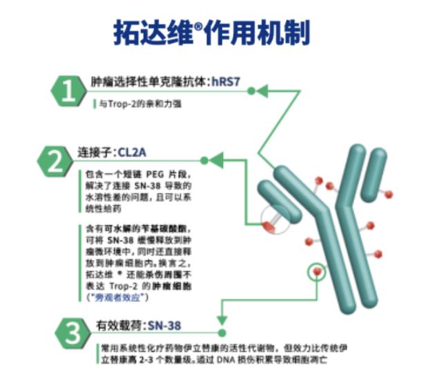 拓达维®(戈沙妥珠单抗)是全球首个且唯一获批的靶向Trop-2的抗体偶联药物,用于治疗复发或难治性转移性三阴性乳腺癌,其针对的靶点Trop-2受体是一种在许多类型肿瘤(包括超过90%的乳腺癌和膀胱癌)中均过度表达的细胞表面抗原。拓达维®亮相进博会意味着吉利德中国开始进入肿瘤领域。