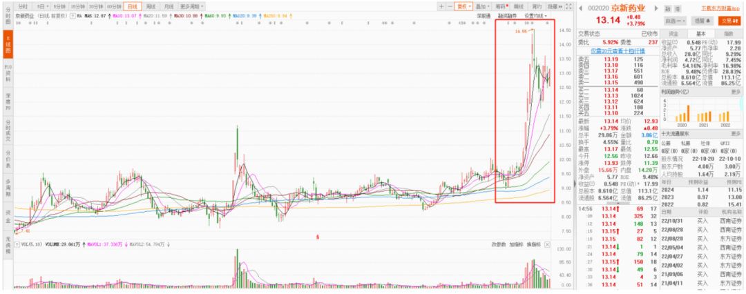 2022年3月,京新药业向国家药监局递交了安达西尼(EVT201)的上市申请,目前已进入上市审评阶段,预计2023年上市。这一利好消息,使得京新药业的股价被爆炒并创出历史新高。