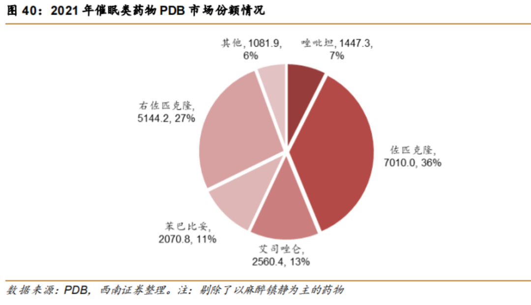 根据西南证券研报显示,2021年催眠类药物PDB市场份额TOP5分别为佐匹克隆、右佐匹克隆、艾司唑仑、苯巴比妥和唑吡坦,其中佐匹克隆和右佐匹克隆占比超60%,市场竞争格局相对缓和。