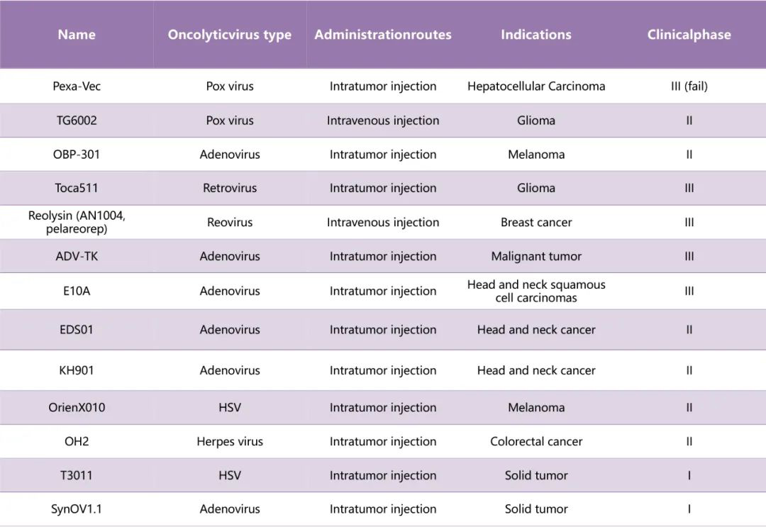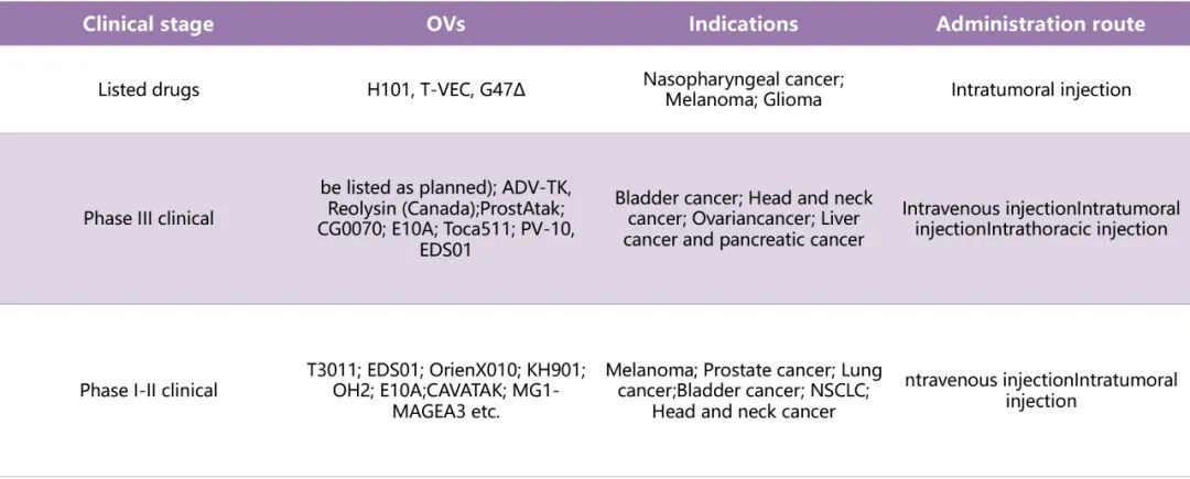 2018年,Opdivo和Keytruda被批准用于商业用途,推动了中国免疫疗法的发展。OVs作为一种免疫疗法,对实体肿瘤有显著的治疗效果,其适应症不断扩大。随着我国医疗领域的快速发展和政府对OVs行业监管体系的完善,目前我国已开展10多种OVs的临床研究(表3),其具有广阔应用前景。Toca511、 reolysin、ADV-TK和E10A OVs已经进入III期临床阶段。
