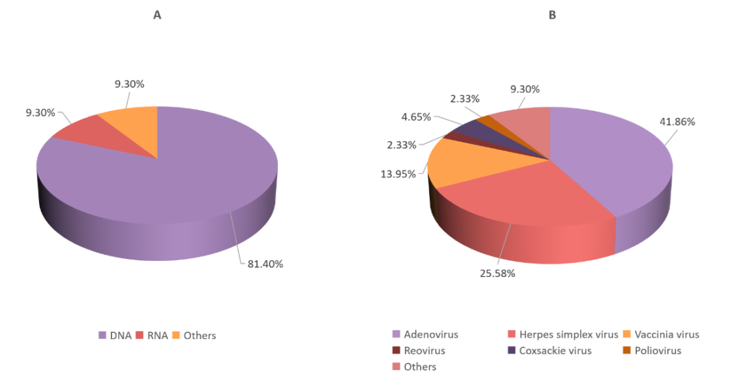 截至2021年10月1日,已开展的OVs的临床研究共408项。表1列出了大约31种OVs产品的临床分期。在所有关于OVs的抗肿瘤临床研究中,I期和II期约占全部临床研究的80%;III期约占全部临床研究的6%,且大部分仍处于起步阶段。迄今为止,在研的OVs中,DNA病毒占总体的81.4%,包括腺病毒(41.86%)、单纯疱疹病毒(25.58%)和牛痘病毒(13.95%),RNA病毒占9.3%(图1)。