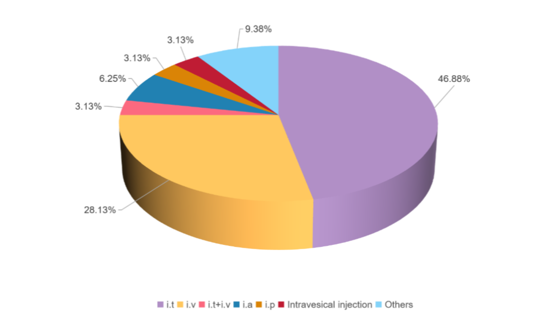 在全球OVs研究的各种给药途径中,肿瘤内注射占58.6%,其次是静脉注射(23.03%)。根据对全球III期临床试验给药途径分布的统计,肿瘤内注射占全部III期研究的46.88%,静脉注射占28.13%。