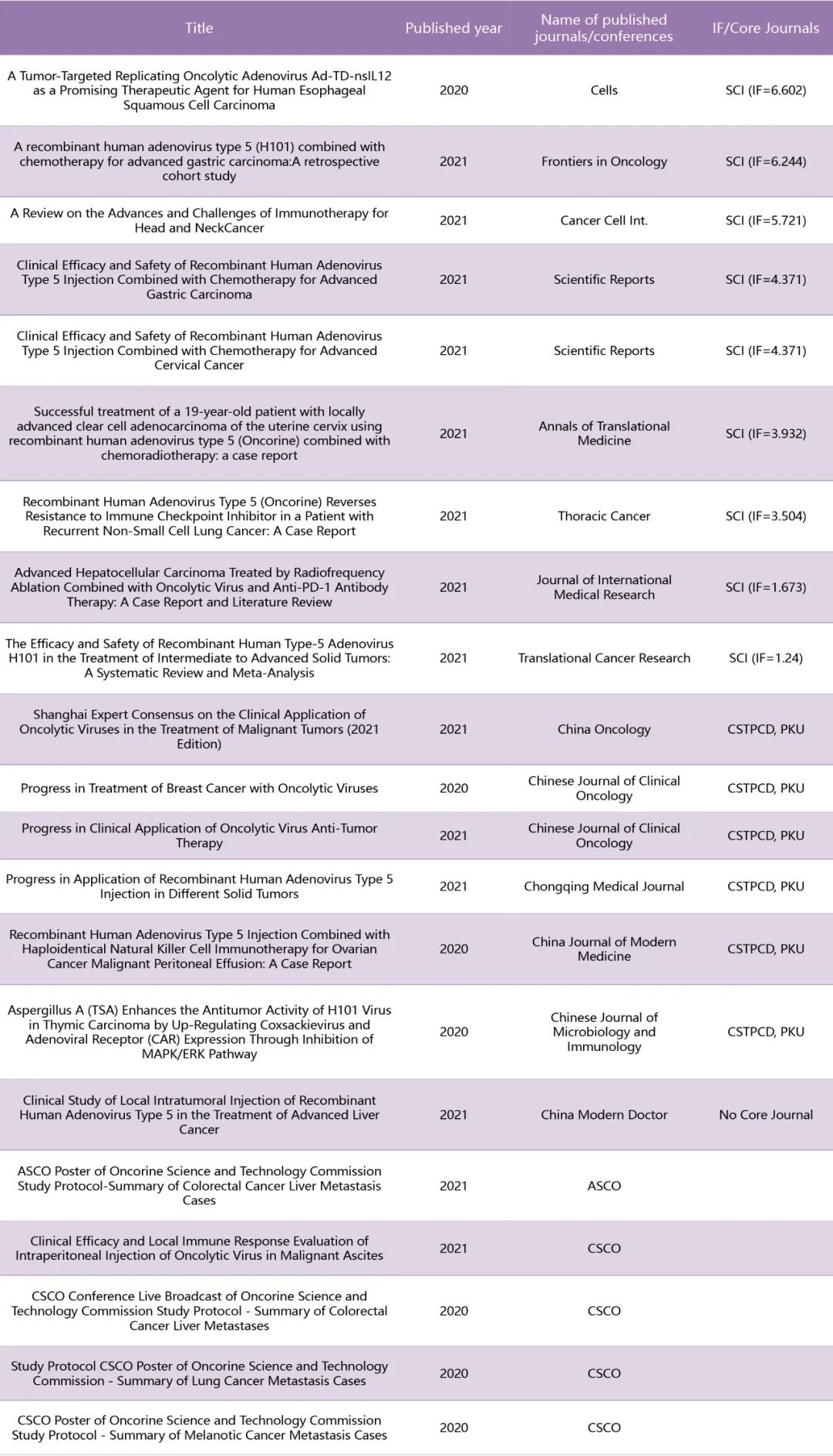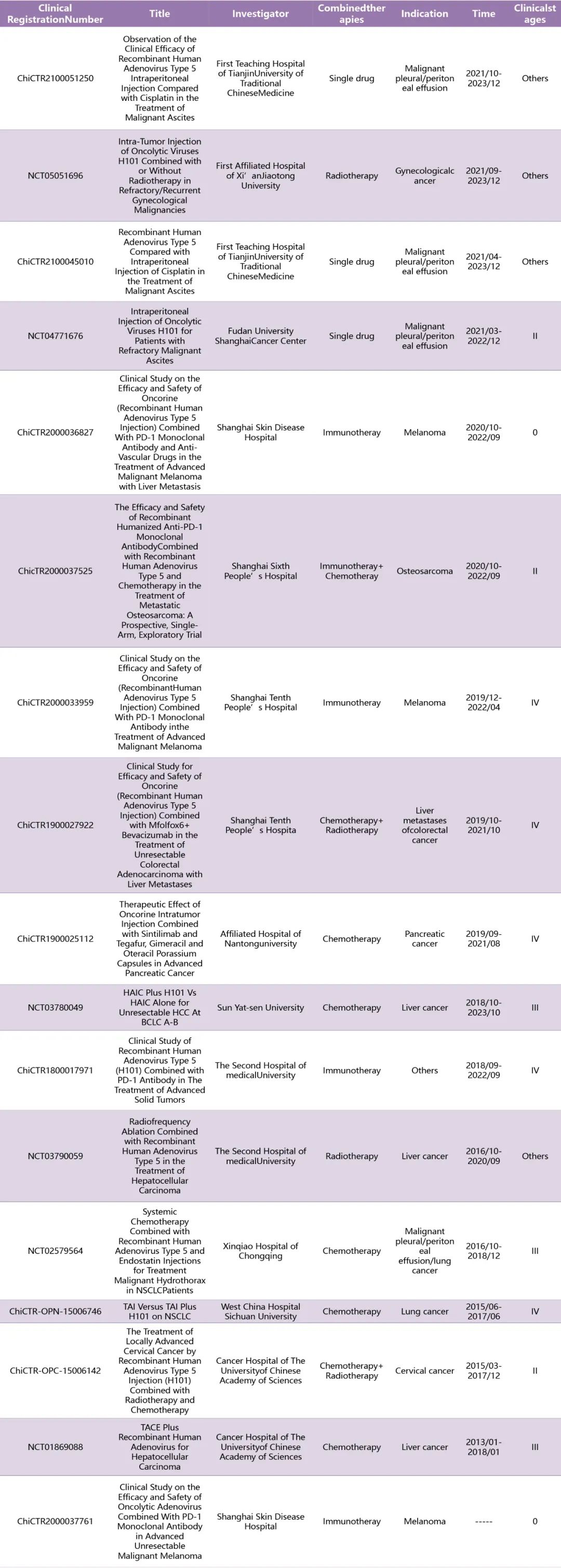 目前,H101是中国唯一上市的OVs产品,其新适应症被不断探索。尽管关于H101联合化疗治疗晚期鼻咽癌患者以及其他实体肿瘤的证据积累了十多年,但其潜在机制和新的临床指征,包括恶性胸腔积液、黑色素瘤、肝癌和肺癌,仍有待探索。自2019年以来,H101的基础及临床研究取得了显著进展。一项对最近注册的临床研究和相关文章的调查显示,自2019年以来,有9项关于H101治疗肿瘤的注册临床研究(表4),并发表了19篇文章(表5)。