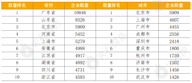 从新增企业地域分布来看,企业数量排名前十的省份为广东省、山东省、北京市、河南省、上海市、安徽省、江苏省、湖南省、四川省、浙江省,占全国新增企业总量的59.43%。企业数量排名前十的城市为北京市、上海市、广州市、成都市、深圳市、重庆市、杭州市、济南市、长沙市、武汉市,占全国新增企业总量的27.18%。