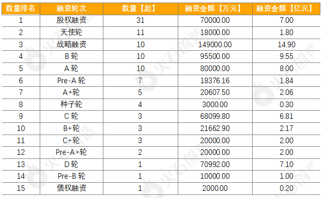 从融资数量来看,以股权融资和天使轮发生的融资事件最多,分别为31起和11起。从融资金额来看,战略融资获得最高融资金额14.90亿元;其次,B轮融资金额也较为突出,融资金额达9.55亿元。