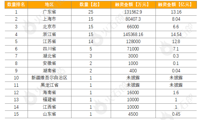 从融资地域看,本月融资事件分布最多的省份为广东省,融资数量为25起。从融资金额来看,浙江省最为突出,融资金额高达14.54亿元;其次,广东省也较为突出,融资金额达13.16亿元。