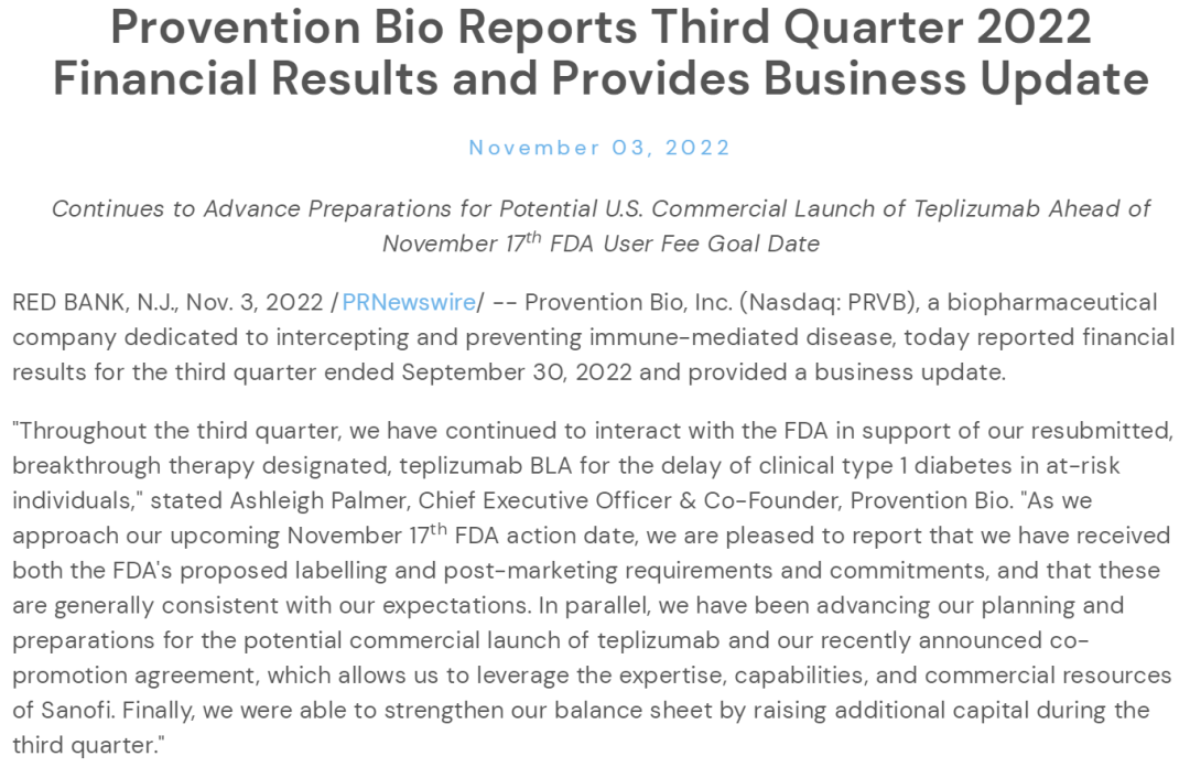 2022年11月3日,Provention Bio宣布CD3抗体Teplizumab的最新进展,今年2月重新递交上市申请后获得FDA授予突破疗法认证,PDUFA日期为11月17日。今日,Provention收到FDA发出的提议说明书以及上市后要求。Provention称这与公司预期一致,已经进一步推进商业化准备。