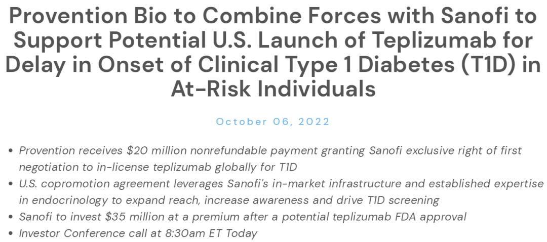 Teplizumab去年曾首次递交上市申请,但因为生产变更之后未进行PK可比性研究被FDA拒绝批准。合作方礼来选择退回Teplizumab权益,今年10月,Provention Bio宣布与赛诺菲达成合作,赛诺菲以2000万美元获得Teplizumab的优先选择权(ROFN),并对Provention Bio进行3500万美元的股权投资。
