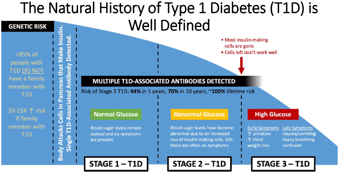 一型糖尿病虽然仅占糖尿病的5%,但由于胰腺β细胞的损伤导致胰岛素的绝对缺乏,对患者的生存质量产生重大影响。有一型糖尿病家族史的人患病的风险提高10-15倍。
