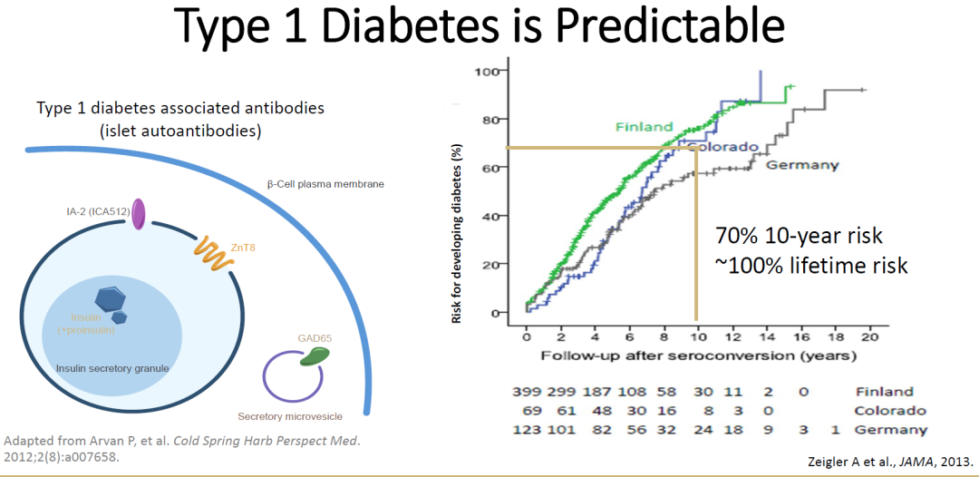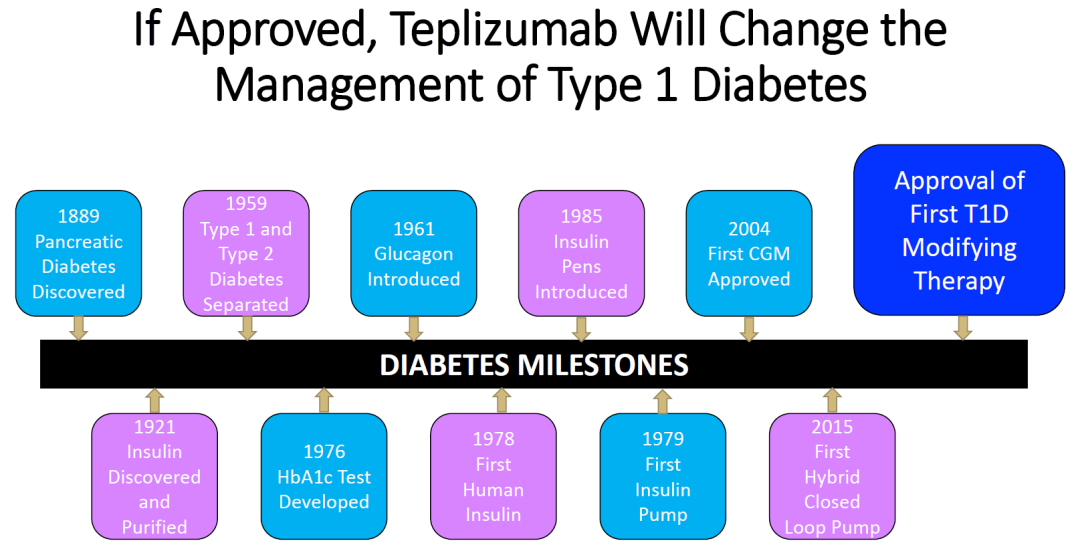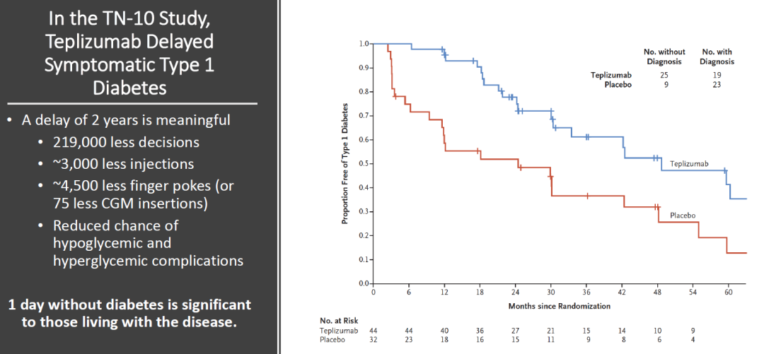 Teplizumab为一种CD3抗体,可以显著减少高危人群发展之一型糖尿病的概率,显著延长发展至胰岛素依赖的临床疾病发生的时间(延长2年)。