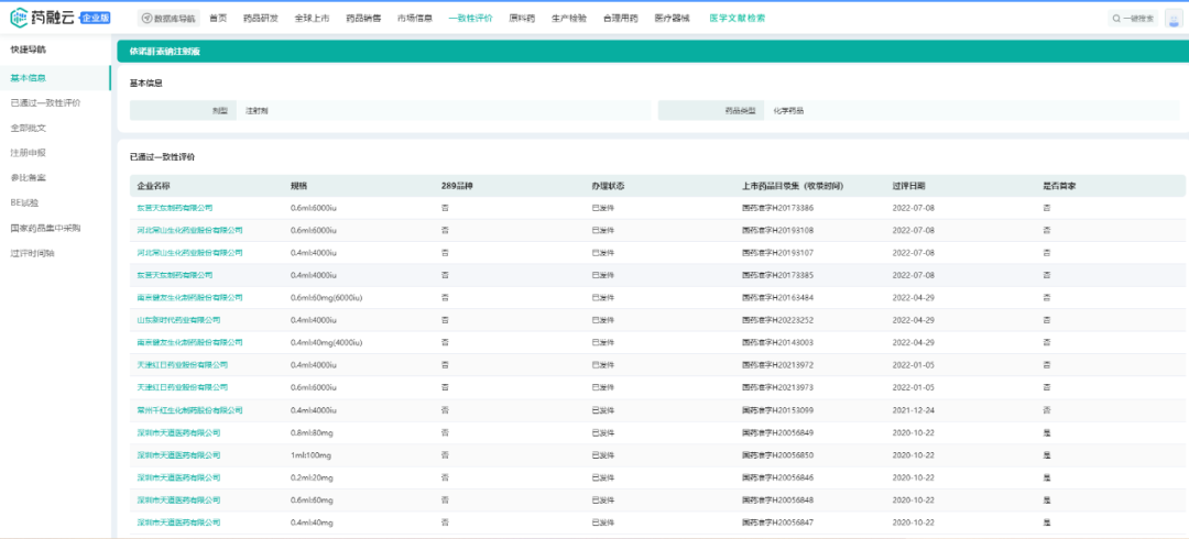 根据药融云数据库显示,此前国内获批的依诺肝素钠注射液的企业达到10家,其中,深圳市天道医药、常州千红生化制药、天津红日药业、南京健友生化制药、山东新时代药业、河北常山生化药业、东营天东制药,7家企业的依诺肝素钠注射液通过一致性评价。