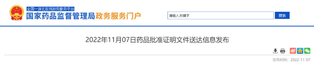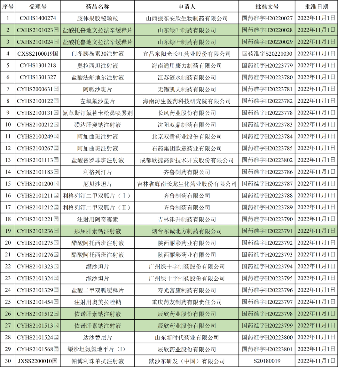 11月7日,NMPA公布2022年11月07日药品批准证明文件送达信息,共30品规药品获批上市,包括:
