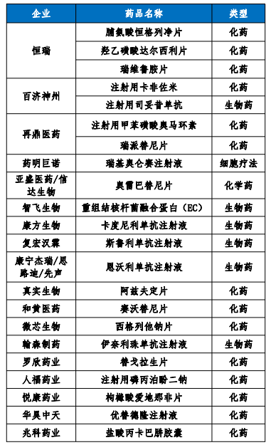 其中,有20余款国产重磅创新药(包括引进)是首次参与国谈。其中,恒瑞有3款新药,百济神州、再鼎医药各有2 款新药。