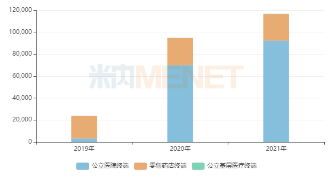奥拉帕利自上市后,随着适应症的不断拓展及获批地区的逐渐增加,其销售额一路猛涨,且受后来者影响甚小。据悉,2021年其全球销售额超过30亿美元,是当之无愧的重磅炸弹药物。米内网数据显示,奥拉帕利进入医保后在公立医院终端(城市公立医院+县级公立医院)的销售额快速增长,而在零售药店终端则保持稳定,公立基层医疗终端市场有待开发。2021年,该产品在三大终端6大市场合计销售额突破10亿元。今年也保持了高速增长态势,市场前景可观。