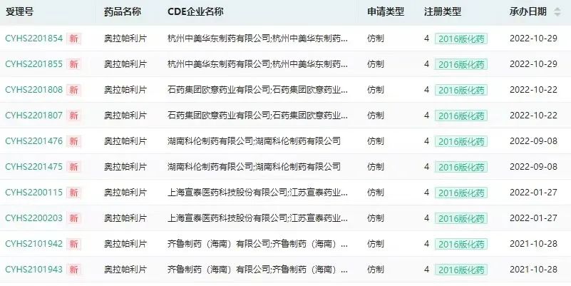 国内奥拉帕利仿制申报上市概况