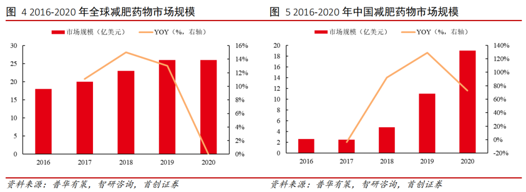 2016-2020年,全球减肥药物市场从18亿美元提升至26亿美元,中国市场则从2.6亿人民币提升至19亿人民币,国内增速显著高于全球。