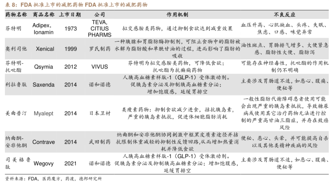目前,FDA批准了6款减肥适应症的药物,而国内则仅仅只有奥司利他获批。