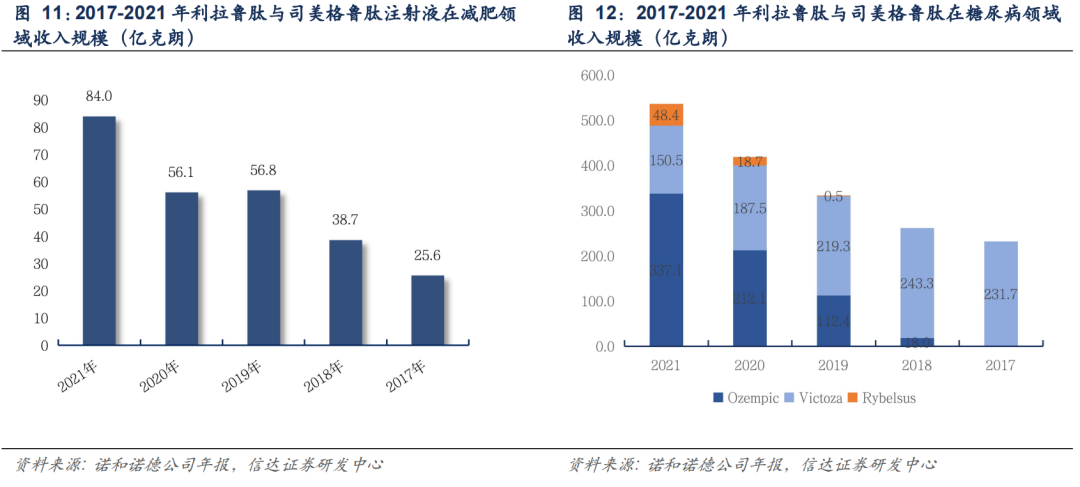 在减重领域,2021年利拉鲁肽和司美格鲁肽实现收入84亿丹麦克郎,出货规模超过10亿美元;考虑到司美格鲁肽21年才开始放量,未来成长空间广阔。
