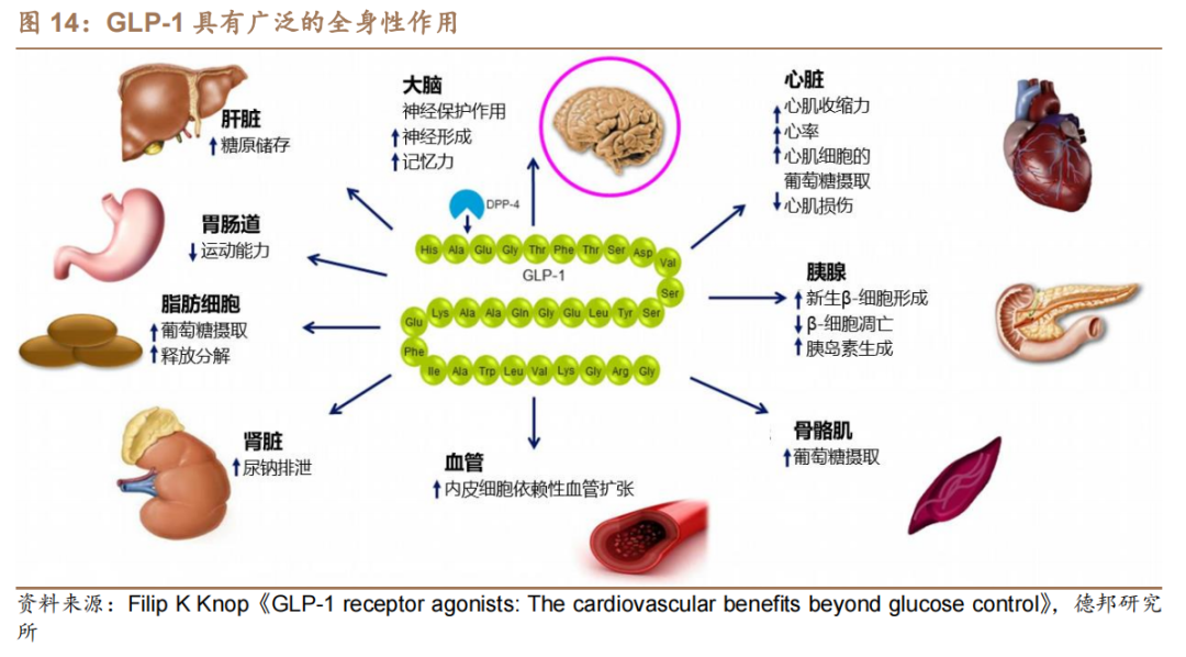 1)GLP-1是一种肠促胰岛素,可激活遍布全身各器官的GLP-1受体,可增强胰岛素分泌并抑制胰高糖素分泌,能够延缓胃排空,并通过中枢性的食欲抑制减少进食量,从而达到降低血糖、减肥等作用。