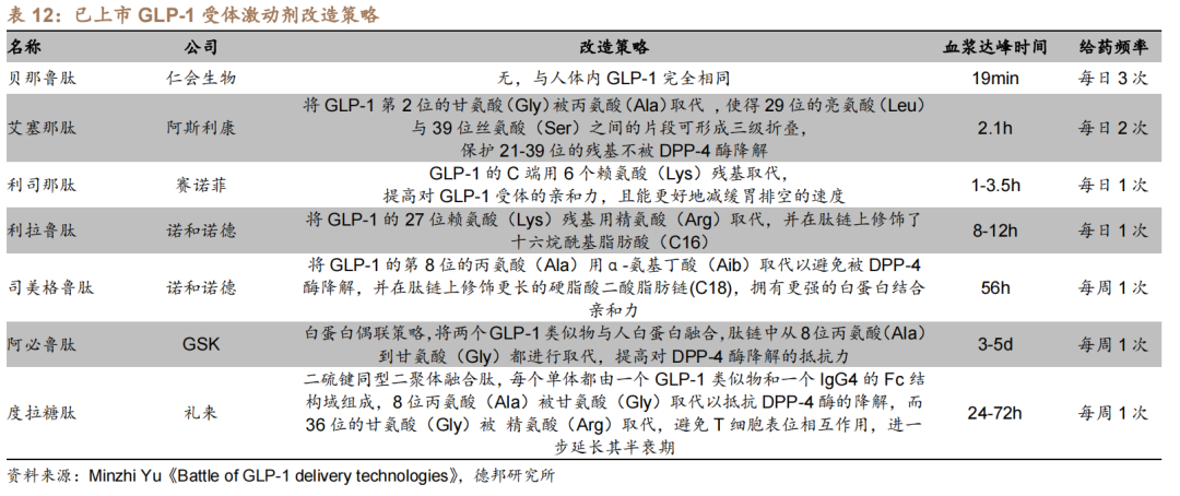 2)基于靶点效果优异,GLP-1长效化成为药企重要的开发策略,并且历史上有利拉鲁肽、司美格鲁肽等爆品药物指引,提升了探索的成功率。