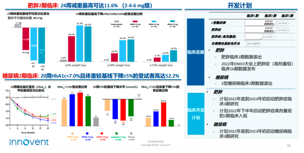 2022年信达生物公布Ib期的研究结果:IBI362(Mazdutide)高剂量用药组给药12周减重幅度即超过11.5%,成为早期临床呈现效果最好的减肥单药之一。
