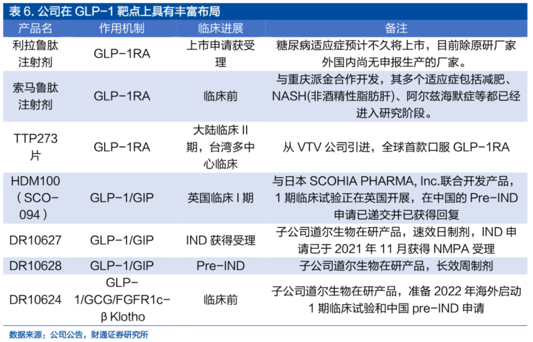 华东医药通过自研、收购、BD等多方式整合了一个管线体系,目前司美格鲁肽(索马鲁肽)注射液临床申请获受理,从VTV公司引进的TTP273口服制剂2022Q1完成了二期临床最后一例受试者出组,子公司道尔生物研发的多重激动剂DR10624于2022年4月获批在新西兰开展一期临床。
