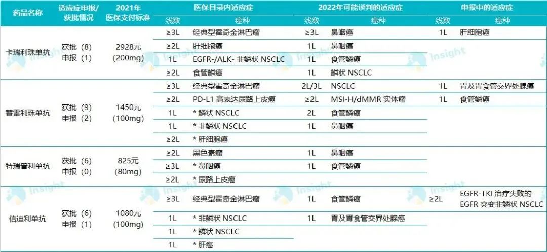除了已经获批的适应症之外,各大药企也在为自己的产品争抢新的适应症。根据医保初审名单公布的信息,君实、信达、恒瑞、百济神州的产品都以目录内条件2(2017年1月1日至2022年6月30日期间,经国家药监部门批准,适应症或功能主治发生重大变化的药品)进入到本次医保目录调整的初审名单。
