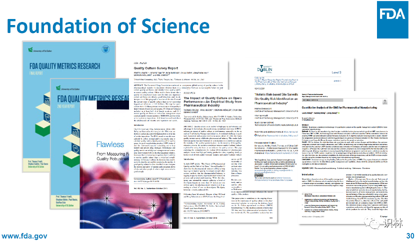 在介绍完药品短缺和药品质量这两大话题以后,就开始引入质量管理成熟度的介绍。FDA表示,QMM计划的推动依赖于已有的科学研究基础。这里引用了4篇相关的学术研究,值得一提的是,在这4篇学术研究中,除PDA以及圣加仑大学的质量文化等研究外,FDA放在幻灯片最前面的是美国“药物创新杂志”发表的北京大学的题为“Quantitative Analysis of the QMS for Pharmaceutical Manufacturing(药品生产质量管理体系的定量分析)”的文章,该文章首次基于中国药企的实证数据,提出一套对药品生产质量管理体系 (QMS) 进行定量分析的统计学方法。