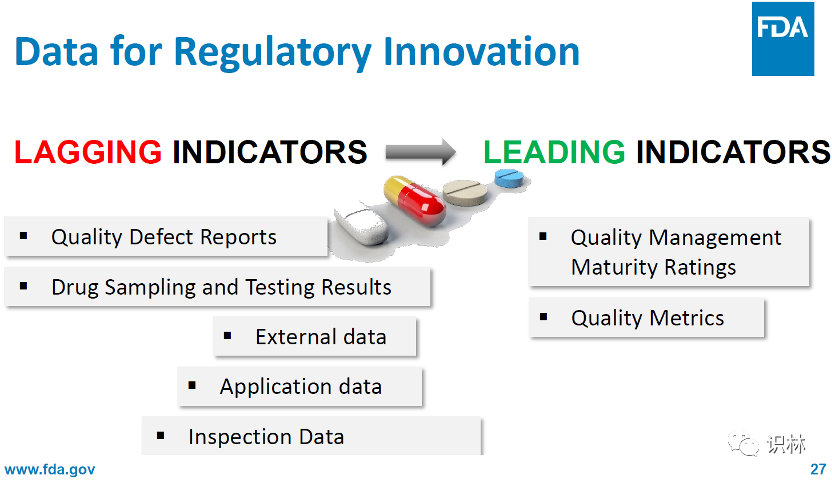 FDA强调,实现QMM需要监管创新数据的支持,并首次提出数据分为滞后指标(Lagging indicators)和领先指标(Leading indicators),而这两个概念也是FDA引自上文提到的北京大学的研究文章(通过数据分析,找到质量管理体系的领先指标是该文章的主要结论)。FDA建议的滞后指标包括:质量缺陷报告、药物抽样和检测结果、外部数据、申请数据、检查数据;领先指标包括:质量管理成熟度评级、质量量度。强调监管机构无法解决滞后指标的许多问题。真正的创新需要新的数据和基于科学的领先指标。企业应该通过对滞后指标的数据分析,寻找与领先指标之间的关联,从而对特定指标进行整改,最终实现质量管理成熟度的目标。