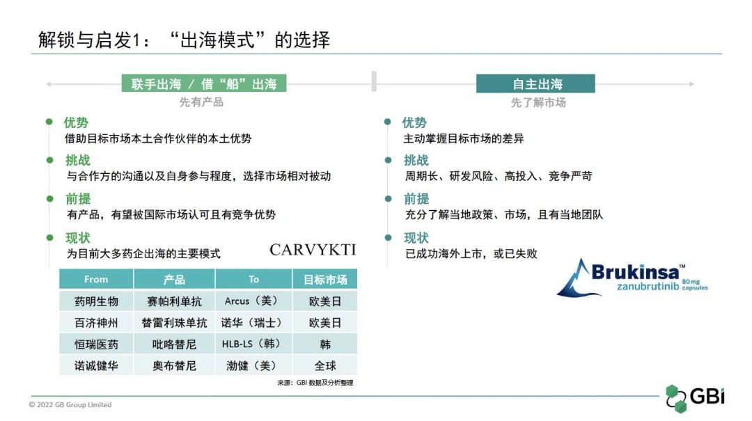先了解市场,即把全球化作为企业的战略方向,在立项之初即考虑全盘,再进行“自主出海”。创立于美国的百济神州可谓“自主出海”的典范。事实上,百济神州在立项之初的靶点选择原则十分值得借鉴:概念验证已有明确数据支持、科学家们对靶点及化合物充分了解、具备best-in-class潜质。泽布替尼自2012年起立项,彼时全球还没有BTK抑制剂获批,百济神州科研团队紧抓化合物特点,优化研发路径,极大节省了开发时间。GBI认为,百济的优势在于主动掌握了目标市场的特色和未满临床需求,同时积极在多个国家布局相关临床试验,最终在兼备“足够的创新”和“足够充分的证据”的情况下,在“挑剔”的美国成功上市。