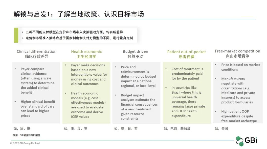 目标市场:国际市场准入环境最突出的特点是复杂多变。一款药品从获批上市到被患者使用,在不同国家要经过不同的流程,且各国定价和报销政策背后的驱动因素不尽相同,整体上可分为以下五类: