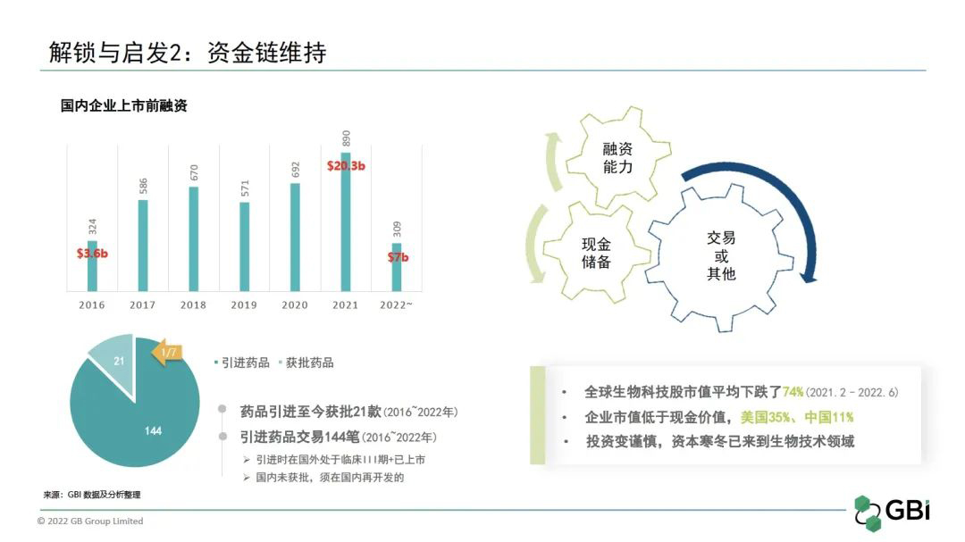 一方面源于中美经济脱钩的国际环境,资本突然退潮,另一方面则是中国创新药本身和国内准入环境的问题。“缺乏源头创新”是目前我国创新药最明显的问题和挑战,这也造成了一个产品上市后不久就面临激烈同质化竞争的现象,为医保谈判提供了更多议价空间。对此,在GBI对话宋瑞霖会长时,他表示,我们都没有把创新做到最大化,但是把价格谈到了最小化,于是创新药的回报就变小了。这几方面因素导致了中国biotech估值迅速下跌,整个生物医药行业的资本开始冷静了。